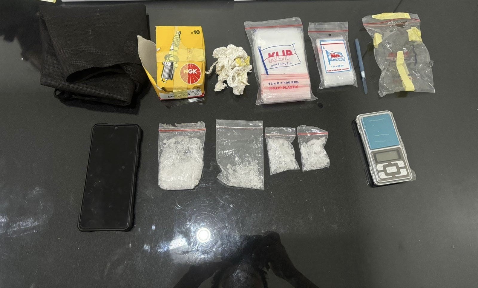 Dari penggeledahan lanjutan di sebuah rumah sekitar lokasi, polisi menemukan empat saset narkotika jenis sabu dengan berat bruto sekitar 65 gram yang disimpan dalam kantong kain hitam. Selain sabu, polisi juga menyita satu unit telepon genggam, timbangan digital, puluhan plastik klip kosong, sendok sabu, tisu, serta kotak pembungkus busi.