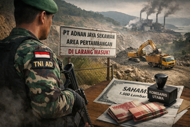 Berdasarkan dokumen yang diterima media ini, seorang prajurit aktif TNI AD berpangkat Kopral Satu (Koptu) bernama Aditia Warman tercatat sebagai Komisaris Utama sekaligus pemegang saham mayoritas di perusahaan tambang PT Adnan Jaya Sekawan (AJS).
