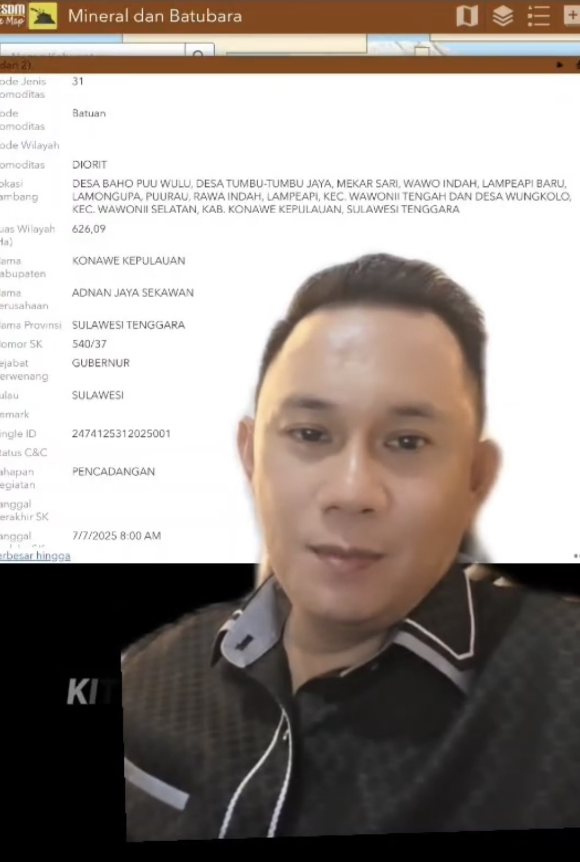Dalam video itu, Andri mengulas secara eksplisit bahwa pencadangan Wilayah Perizinan Pertambangan (WPP) batuan di Pulau Wawonii tercatat dikeluarkan melalui Surat Keputusan Gubernur Sultra Nomor 540, dengan luas mencapai 626 hektare.