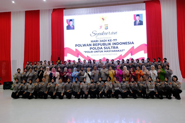 Deliksultra.com, Kendari – Kepolisian Daerah (Polda) Sulawesi Tenggara menggelar syukuran memperingati Hari Jadi Polisi Wanita (Polwan) Indonesia ke-77. Acara berlangsung di Aula Dhacara Polda Sultra, Rabu (24/9/2025) pagi.