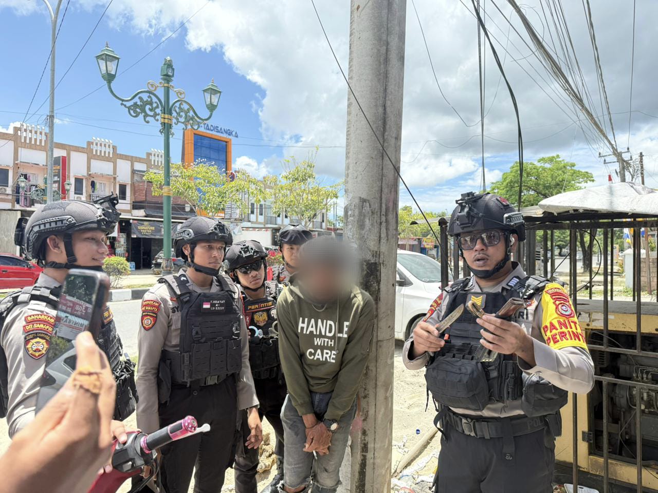 Kegiatan patroli dipimpin oleh Ipda Arif Rahman, S.H., M.P.W.K., M.H. selaku Perwira Pengendali bersama Bripka Boy Sagita sebagai Dantim. Saat pemeriksaan, petugas mendapati pelaku membawa senjata tajam (sajam) jenis badik yang diselipkan di pinggang kirinya.