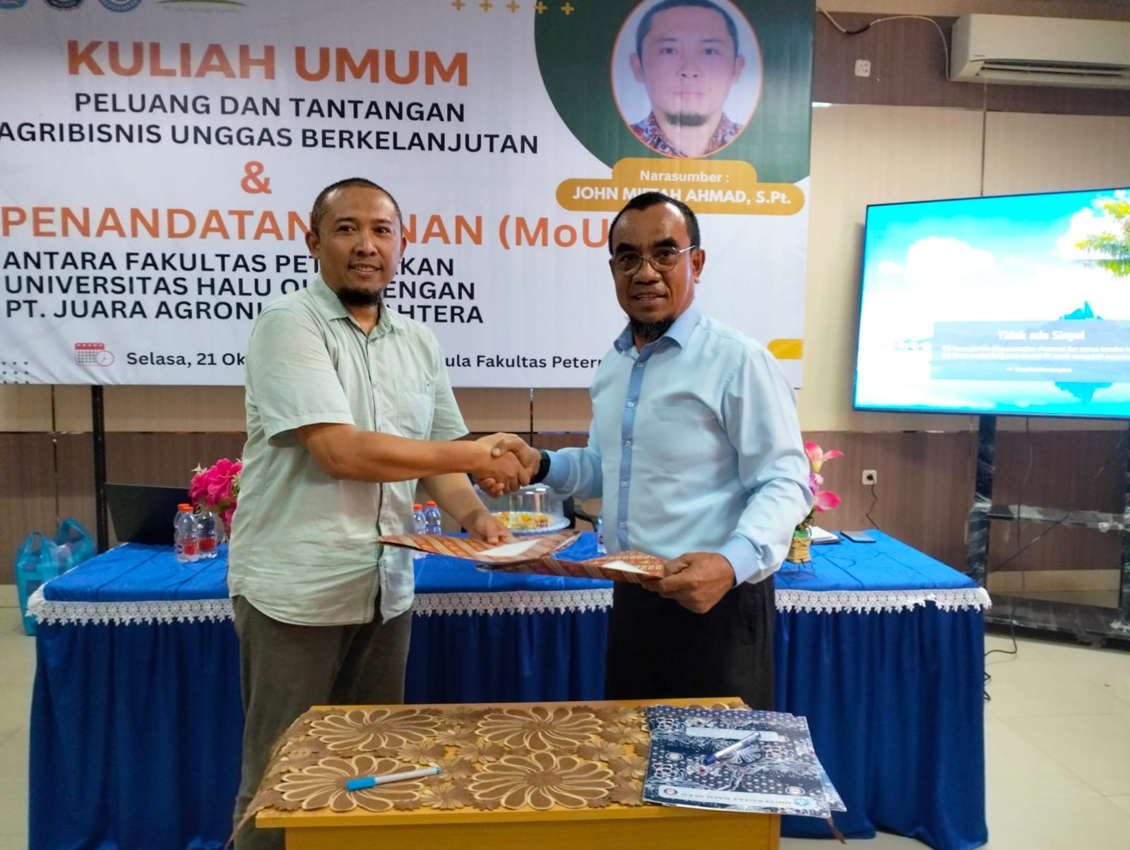 Sementara itu, Direktur Utama PT Juara Agroniaga Sejahtera, John Miftah Ahmad, S.Pt., menuturkan bahwa pihaknya telah lama menjalin hubungan baik dengan Fakultas Peternakan UHO. Sejauh ini sudah merekrut lima alumni UHO yang kini bekerja sebagai MarketingPakan Ayam di Malang, Jawa Timur, juga sebagai tempat pelaksanaan magang profesi mahasiswa akhir FPt UHO, serta serta kuliah umum seperti hari ini.