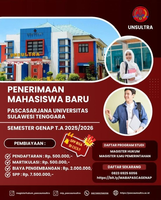 Deliksultra.com, Kendari – Kesempatan melanjutkan studi ke jenjang lebih tinggi kembali dibuka oleh Universitas Sulawesi Tenggara (Unsultra). Kampus ini mulai menerima pendaftaran mahasiswa baru untuk program pascasarjana pada semester genap tahun akademik 2025/2026.